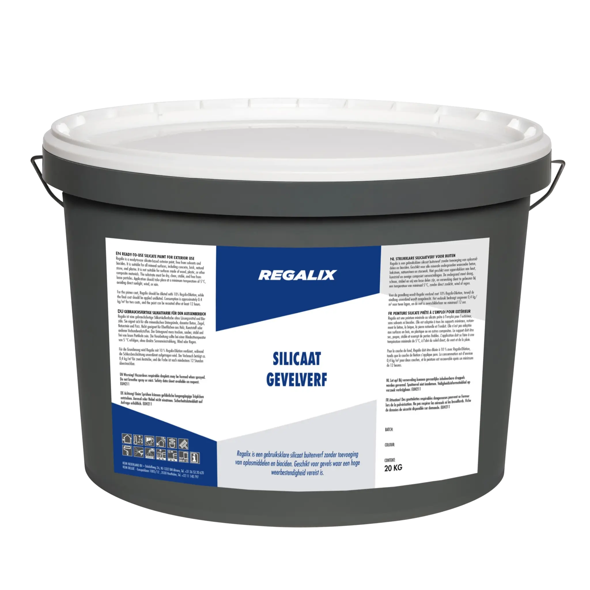 Regalix is een strijkklare dispersie-silicaat muurverf uitermate geschikt voor buitengevels die te maken hebben met extreme weercondities. Regalix is kleurvast en UV-bestendig en beschikbaar in donkere kleuren. Regalix kan op alle minerale ondergronden worden toegepast. Regalix is dankzij haar uitstekende producteigenschappen geschikt voor zowel renovatie als nieuwbouw. Maakbaar in donkere kleuren (tot en met RAL9017)